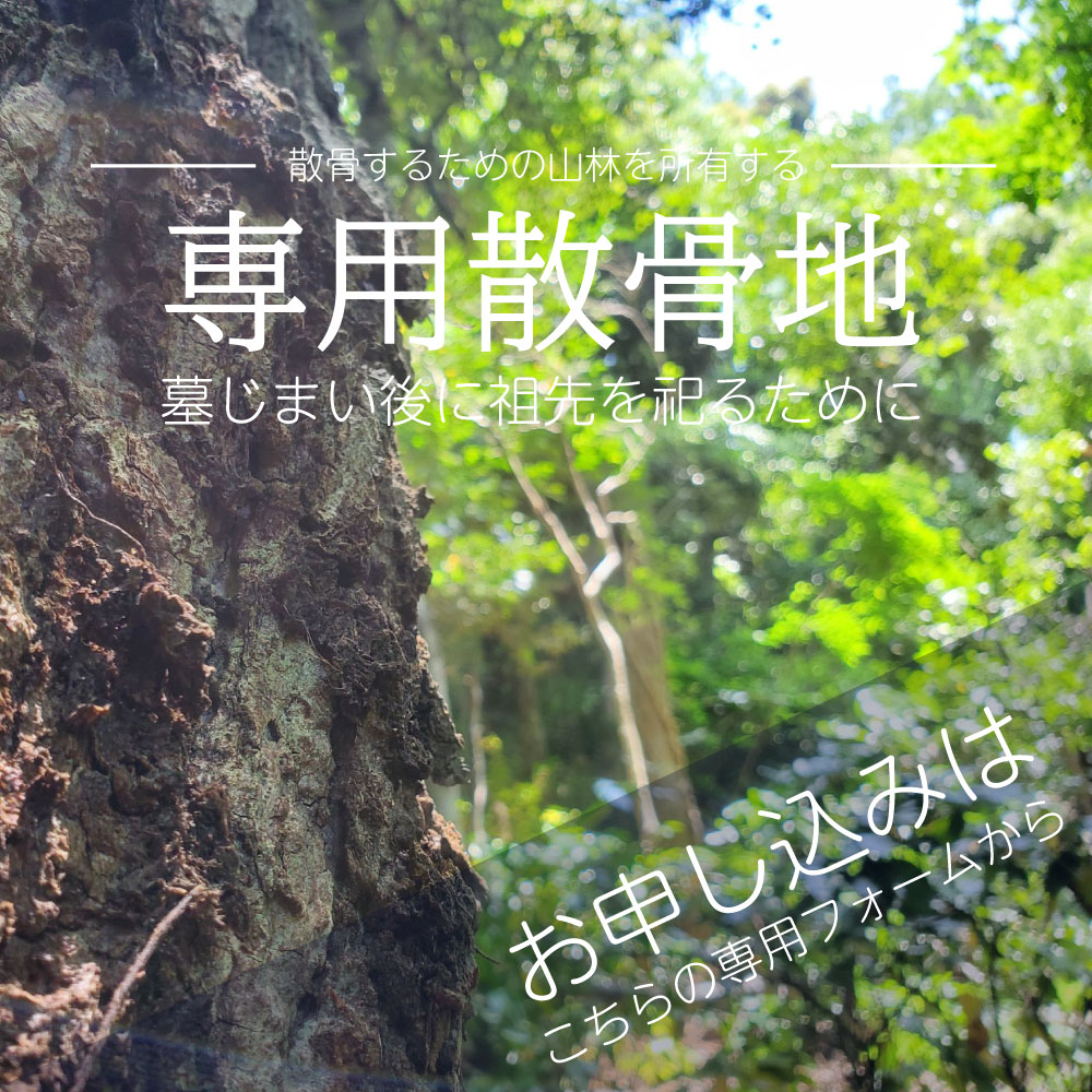 【散骨山】では、ご家族や祖先のための専用散骨地をご用意しております。森自体を所有することができますので、365日、24時間を通して墓参も可能です。いわゆる墓地ではなく、散骨のためのスペースですので、自由にその場所を利用することができます。散骨の場合は、墓地埋葬法の規定により、墓石を設置することはできませんが、故人が好きだった植物を植えたり、記念のモニュメントや小屋を設置することが可能になります。花壇のように植栽することで素敵なガーデンとしての空間づくりができます。もちろん、自由にいつでもお参りしていただくことができます。ペットも親族も制限なく散骨することができます。固定資産税がかかる場合もありますが、山林の場合、高額になることはほとんどありません。もちろん、自己所有ですから、契約期間の制限も年間管理費等の支払い義務はありません。本当の意味で、永代供養できるスペースになります。現在、寺院がどんどん消滅する時代に、墓じまいが進行しています。墓じまいは決して珍しいものではなくなりました。寺院との関係性も薄らぎ、形式的な付き合いのみにもかかわらず管理費や檀家料を支払っているケースも少なくありません。ですが、祖先や家族の永代供養は、必ずしも寺院を経由しなくても可能です。散骨は自己所有の山林であれば、法律に抵触することなくスムーズに散骨ができます。散骨できる山林散骨地の取得は不動産の売買となりますので、名義変更のための税金や事務手続き費用が別途必要になります。司法書士に依頼するため、通常20万円程度の費用が別途かかります。お問い合わせをいただきましたら、まず、散骨場所の不動産情報をお伝えします。ご検討いただいたうえで購入の意識決定をお願いします。もちろん、散骨に関するアドバイスを行わせていただきます。 |