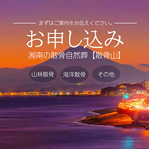 【散骨山】の「散骨自然葬」は、「散骨の聖地」として知られる湘南エリアの自然散骨葬を中心に行っておりますが、さらに細かく散骨場所がお選びいただけます。「山林散骨」では、横浜、横須賀、三浦、鎌倉、逗子、葉山、大磯、小田原、箱根、山北、相模原など、いくつも散骨できる山林がありますので、ご指定いただければ、その山林に散骨を行うことができます。すべての土地は、弊社が所有している土地ですので、末永く末代までもご利用いただけます。弊社が提供している「山林散骨プラン」には、【山林合同散骨代行プラン】【山林個別散骨代行プラン】【山林立ち会い散骨プラン】3つの種類があります。リーズナブルな【山林合同散骨代行プラン】は、ゆうパックで遺骨を送るだけのシンプルなプランです。【山林個別散骨代行プラン】は、個人への弔いを弊社にお任せいただくプランで、ご希望の散骨場所をお選びいただくことができます。【山林立ち会い散骨プラン】の場合には、現地の散骨セレモニーに立ち会っていただくプランですが、散骨した後も、365日いつでもお好きなタイミングでお参りに行けますので、一般墓のようにご利用いただくことができます。山林散骨は、海洋散骨と違い、本当の意味で「土に還る」ことができます。「山林散骨」のすべてのプランは永代供養の自然葬です。一般的な「樹木葬」などのように、一定期間が過ぎたら合祀墓に移されてしまうようなこともありません。管理費などのその後の費用も一切かかりませんので、ご安心いただけます。細かな散骨場所についてですが、風評被害が懸念されるため、場所を特定できる細かな表記はホームページ上では行っておりませんので、ご了承ください。また、「海洋散骨プラン」では、三浦半島からの東京湾、湘南エリアからの相模湾で散骨を行っております。「海洋散骨」につきましても、【海洋合同散骨代行プラン】【海洋個別散骨代行プラン】【海洋立ち会い散骨プラン】の3つのプランをご用意いたしました。【散骨山】の「海洋散骨」は、日暮れ以降の夜の時間帯のみに散骨セレモニーを行っているのが特徴です。昼間の海とは違って、暗闇の中の幻想的な「海洋散骨」になります。いずれにしましても、故人が永眠される場所ですから、ゆっくりとお休みいただけるような静かな環境が望ましいと思います。散骨場所のご希望がございましたら、ぜひお知らせください。 |