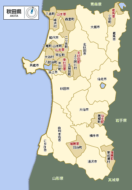 | 秋田市(あきたし),能代市(のしろし),横手市(よこてし),大館市(おおだてし),男鹿市(おがし),湯沢市(ゆざわし),鹿角市(かづのし),由利本荘市(ゆりほんじょうし),潟上市(かたがみし),大仙市(だいせんし),北秋田市(きたあきたし),にかほ市(にかほし),仙北市(せんぼくし),小坂町(こさかまち),上小阿仁村(かみこあにむら),藤里町(ふじさとまち),三種町(みたねちょう),八峰町(はっぽうちょう),五城目町(ごじょうめまち),八郎潟町(はちろうがたまち),井川町(いかわまち),大潟村(おおがたむら),美郷町(みさとちょう),羽後町(うごまち),東成瀬村(ひがしなるせむら) |