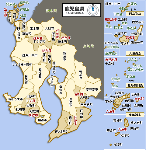 | 鹿児島市(かごしまし),鹿屋市(かのやし),枕崎市(まくらざきし),阿久根市(あくねし),出水市(いずみし),指宿市(いぶすきし),西之表市(にしのおもてし),垂水市(たるみずし),薩摩川内市(さつませんだいし),日置市(ひおきし),曽於市(そおし),霧島市(きりしまし),いちき串木野市(いちきくしきのし),南さつま市(みなみさつまし),志布志市(しぶしし),奄美市(あまみし),南九州市(みなみきゅうしゅうし),伊佐市(いさし),姶良市(あいらし),三島村(みしまむら),十島村(としまむら),さつま町(さつまちょう),長島町(ながしまちょう),湧水町(ゆうすいちょう),大崎町(おおさきちょう),東串良町(ひがしくしらちょう),錦江町(きんこうちょう),南大隅町(みなみおおすみちょう),肝付町(きもつきちょう),中種子町(なかたねちょう),南種子町(みなみたねちょう),屋久島町(やくしまちょう),大和村(やまとそん),宇検村(うけんそん),瀬戸内町(せとうちちょう),龍郷町(たつごうちょう),喜界町(きかいちょう),徳之島町(とくのしまちょう),天城町(あまぎちょう),伊仙町(いせんちょう),和泊町(わどまりちょう),知名町(ちなちょう),与論町(よろんちょう) |