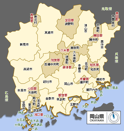 | 岡山市(おかやまし),倉敷市(くらしきし),津山市(つやまし),玉野市(たまのし),笠岡市(かさおかし),井原市(いばらし),総社市(そうじやし),高梁市(たかはしし),新見市(にいみし),備前市(びぜんし),瀬戸内市(せとうちし),赤磐市(あかいわし),真庭市(まにわし),美作市(みまさかし),浅口市(あさくちし),和気町(わけちょう),早島町(はやしまちょう),里庄町(さとしょうちょう),矢掛町(やかげちょう),新庄村(しんじようそん),鏡野町(かがみのちょう),勝央町(しょうおうちょう),奈義町(なぎちょう),西粟倉村(にしあわくらそん),久米南町(くめなんちょう),美咲町(みさきちょう),吉備中央町(きびちゅうおうちょう) |