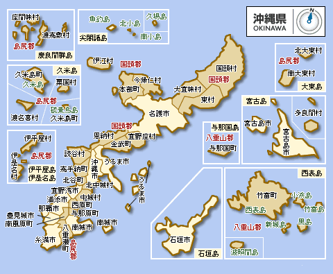 | 那覇市(なはし),宜野湾市(ぎのわんし),石垣市(いしがきし),浦添市(うらそえし),名護市(なごし),糸満市(いとまんし),沖縄市(おきなわし),豊見城市(とみぐすくし),うるま市(うるまし),宮古島市(みやこじまし),南城市(なんじょうし),国頭村(くにがみそん),大宜味村(おおぎみそん),東村(ひがしそん),今帰仁村(なきじんそん),本部町(もとぶちょう),恩納村(おんなそん),宜野座村(ぎのざそん),金武町(きんちょう),伊江村(いえそん),読谷村(よみたんそん),嘉手納町(かでなちょう),北谷町(ちやたんちょう),北中城村(きたなかぐすくそん),中城村(なかぐすくそん),西原町(にしはらちょう),与那原町(よなばるちょう),南風原町(はえばるちょう),渡嘉敷村(とかしきそん),座間味村(ざまみそん),粟国村(あぐにそん),渡名喜村(となきそん),南大東村(みなみだいとうそん),北大東村(きただいとうそん),伊平屋村(いへやそん),伊是名村(いぜなそん),久米島町(くめじまちょう),八重瀬町(やえせちょう),多良間村(たらまそん),竹富町(たけとみちょう),与那国町(よなぐにちょう) |