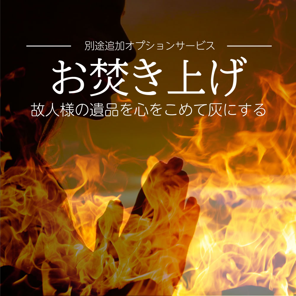 【お焚き上げ】とは、故人の遺品、遺族が今後使う予定のない故人の愛用品、神仏にまつわる物、故人が持っていた写真アルバムなどを火で浄化し、供養するセレモニーです。故人のご遺体は火葬することで、荼毘に服していても、現在ではお棺にたくさんの故人が所有していた品々までを入れて一緒に火葬することはできません。【お焚き上げ】は、火の神様の力を借りて、魂のこもった品々を天に還すという意味合いや、故人の念がこもった品々をあちらの世界にいる故人さまの元へ届けるという意味合いがあります。