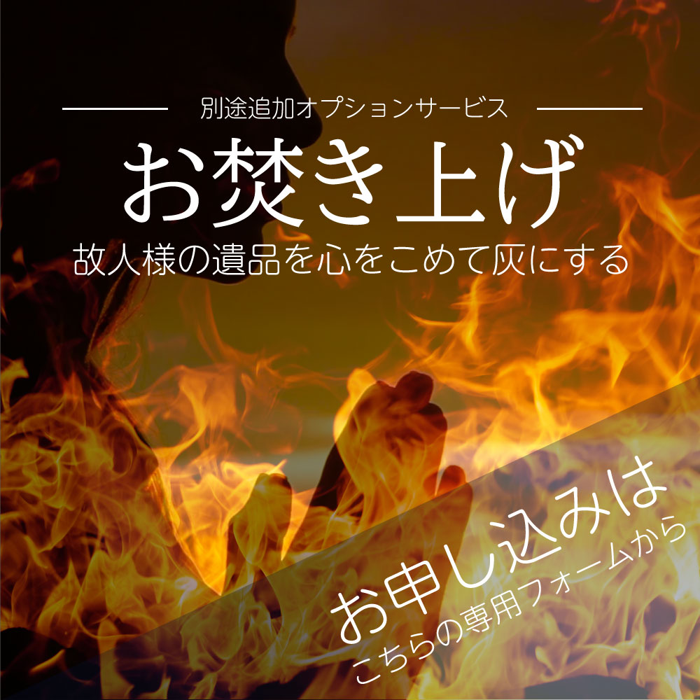 故人が大切にしてきたものを、突然にゴミとして処分することは、少し忍びない感じがします。不要なモノとして捨てることに対する罪悪感もなくなりますし、今まで故人を生前支えてくれていた品々に感謝をして送り出すことで、遺族としてできる最大限のことをしたという充実感を感じることができるはずです。お焚き上げでできた灰についても、弊社ではゴミとして処分することは行っておりません。故人さまを散骨した場所に一緒にまかせていただくことになります。お焚き上げは、散骨と一緒に行っても構いませんし、散骨がすでに終了していて、しばらく時間をおいた後からでも対応可能です。ご遺族様で分類整理をして、お焚き上げする品々をお送りいただいてもかまいませんし、分別する手間暇をかけている余裕がないような場合には、遺品をまとめて段ボール箱でお送りいただければ、弊社で内容を分別することもできます。その場合、必要なものは買取させていただき、それ以外をお焚き上げさせていただくことになります。勝手ながら、一般的に燃やすことができないプラスティック類、金属類はお焚き上げの対象外となりますことをご理解ください。ご不明な点がございましたら、お気軽にお問い合わせくださいますようお願いいたします。 |