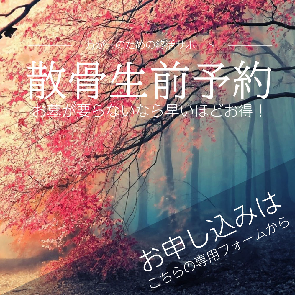 散骨自然葬の生前予約は、プランにつきましては、【山林散骨・立ち会い散骨プラン】に充当させていただいております。ご遺族の方は末永く墓参を行うことができるプランです。立ち会い散骨に同席される方がいらっしゃらない場合は、弊社のスタッフが散骨を行わせていただきます。この場合の内容は【山林散骨・個別散骨代行プラン】になります。死後申し込みによって散骨を承る場合よりも、生前予約の場合はかなり割安価格になっておりますので、散骨自然葬の生前予約はお得なプランとしてご理解ください。通常、【山林散骨・立ち会い散骨プラン】や【山林散骨・個別散骨代行プラン】では、散骨する山林をご指定いただいておりますが、生前予約の場合ににもご指定していただくことができます。もちろん、散骨する山林を弊社におまかせいただく場合も多くありますが、いずれの場合も責任をもって散骨セレモニーを執り行いますので、ご安心ください。山林をご指定いただかない場合には、同意された方と相談の上、ご納得いただいた山林に散骨させていただくことになります。
